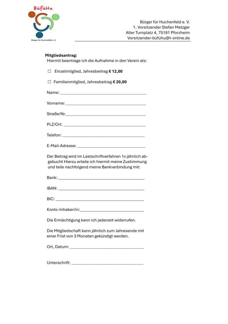 Ihre Mitgliedschaft bei "BüfüHu" (Bürger für Huchenfeld e. V. ) ist von unschätzbarem Wert.